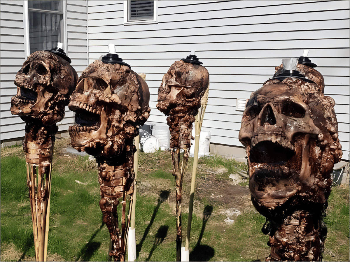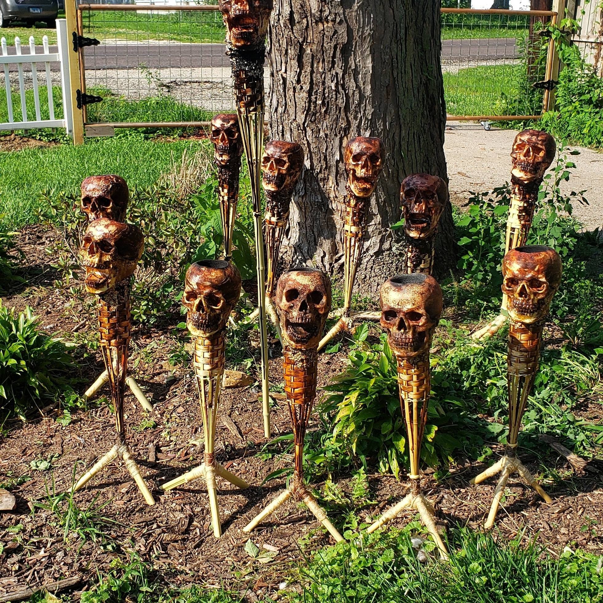 The torches are handmade from bamboo, resin, and plastic human skulls, so they are all unique, and They are 70cm((27 9/16 inches/H)) tall.